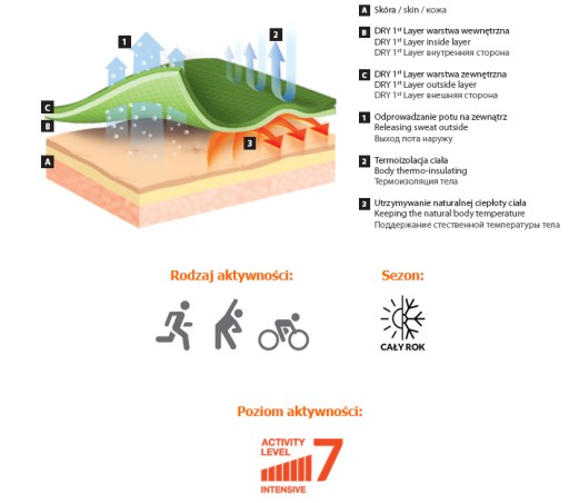 Колекція DRY - ідеальний захист для тіла під час занять спортом для цілорічного використання, рекомендована, зокрема, для бігу, їзди на велосипеді та інших видів активного відпочинку на свіжому повітрі в перехідний період.
