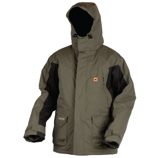 - знімний, утеплений капюшон з регулюванням і згинається козирком, ергономічний крій, завдяки якому капюшон обертається разом з головою рибалки, не обмежуючи видимості, а козирок захищає від проливного дощу