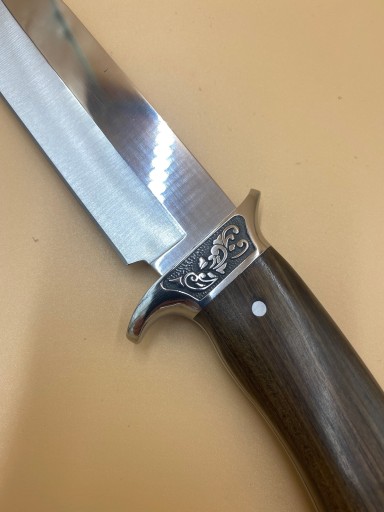 Клинок мисливського ножа великий, виготовлений з якісної сталі, відполірований до високого блиску.