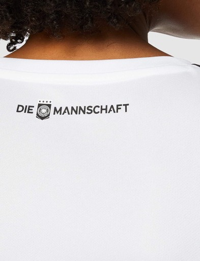 Жіноча домашня сорочка DFB натхненна легендарним дизайном 2018 року домашня сорочка DFB, виготовлена з тканини, що вбирає піт, і трохи ширша за автентичну версію. Тканий логотип DFB з'являється на грудях, а графіка в німецьких національних кольорах з'являється на внутрішній стороні коміра.