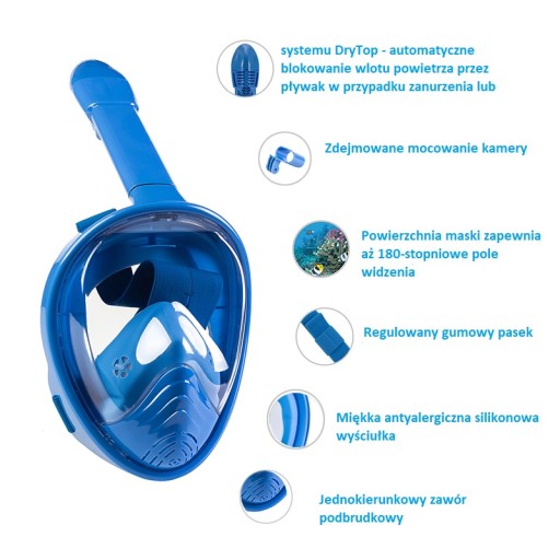 Сучасний дизайн означає, що на відміну від традиційних маска для снорклінгу щільно закриває все обличчя. Широкі прокладки забезпечують відмінну ізоляцію навіть при різких рухах голови. Процес дихання відбувається через спеціальну трубку, закріплену системою DryTop. Завдяки унікальному дизайну дихати в масці природно і приємно - маска не здавлює обличчя, а міцна система кріплення гарантує, що вона не впаде навіть при стрибку у воду. Широкі регульовані ремені кріплення тримають його на місці в будь-якій ситуації.