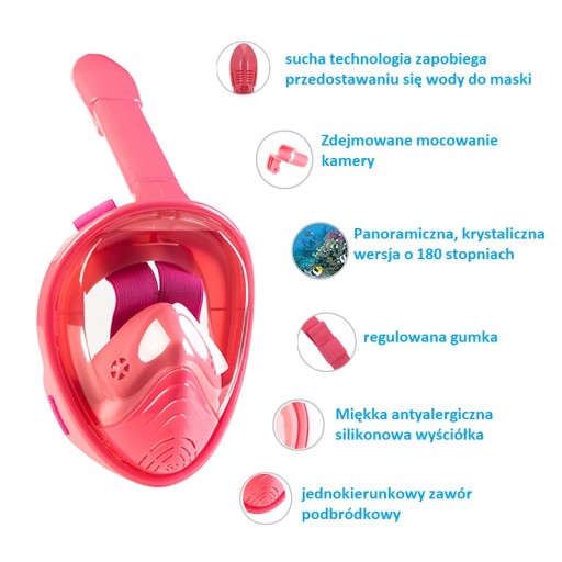 Сучасний дизайн означає, що на відміну від традиційних маска для снорклінгу щільно закриває все обличчя. Широкі прокладки забезпечують відмінну ізоляцію навіть при різких рухах голови. Процес дихання відбувається через спеціальну трубку, закріплену системою DryTop. Завдяки унікальному дизайну дихати в масці природно і приємно - маска не здавлює обличчя, а міцна система кріплення гарантує, що вона не впаде навіть при стрибку у воду. Широкі регульовані ремені кріплення тримають його на місці в будь-якій ситуації.