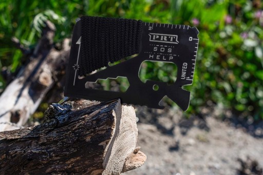 - картка виживання з мотузкою, відкривачкою для пляшок, консервним ножем, лезом, пилкою, плоскою викруткою, викруткою трьох розмірів, лінійкою та сигналами SOS і HELP, написаними алфавітом моржа