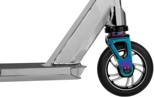 Алюмінієва вилка кріпиться до керма цілими 3 гвинтами. Цей міцний затиск дозволяє самокату впевнено виконувати всі трюки. Платформа також зроблена з алюмінію, що робить скутер легким і маневреним.
