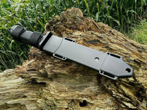 Тактичний ніж з фіксованим лезом з міцної нержавіючої сталі з чорним покриттям, яке ідеально захищає від корозії та небажаного відблиску.