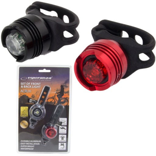Велосипедний ліхтар Esperanza ACRUX складається з ПЕРЕДНЬОГО ліхтаря з білим світлом і ЗАДНЬОГО ліхтаря, що випромінює червоне світло.