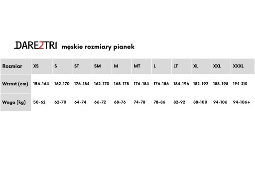 Чоловічий гідрокостюм Dare2Tri Mach3 доступний у розмірах: XS, S, SM, M, MT, L, LT, XL, XXL, XXXL.