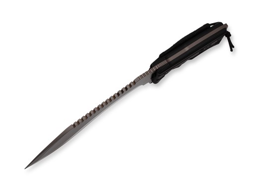 Лезо має класичний профіль точки падіння та зубці на тильній стороні, що служить функціональною пилкою.
