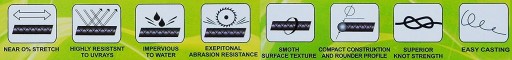 Плетінка виготовлена з високоякісних волокон, характеризується високою міцністю вузла і нульовою розтяжністю. М'який, стійкий до будь-яких механічних пошкоджень.