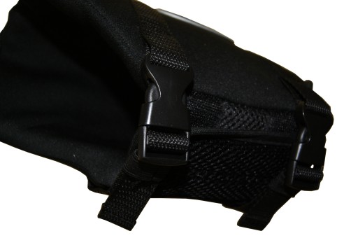 Жилет застібається на липучку та регульовану пряжку на шиї. Він оброблений м'якою сіткою, яка не натирає собаку. Під животом є застібка-липучка, також оброблена дихаючою сіткою, і одна або дві лямки з пряжками (залежно від розміру). Зверху є ручка для витягування собаки з води та металева ручка для кріплення повідка. Весь жилет виготовлений з м'якого неопрену. Крім того, має світловідбиваючі елементи.