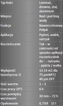 Використовується для захисту поверхні від води, морської атмосфери, подряпин і зміни кольору під впливом УФ-випромінювання. Для використання на алюмінієвих, сталевих, дерев'яних і ламінованих поверхнях, загрунтованих епоксидним грунтом.