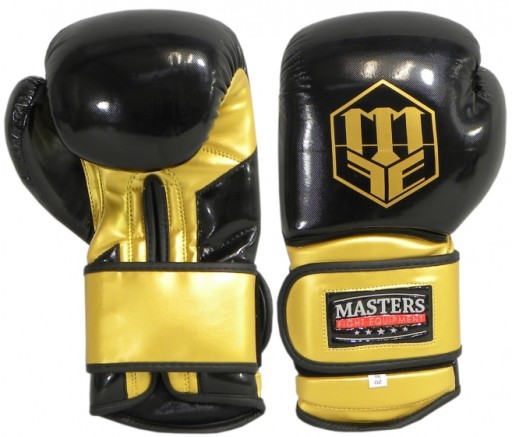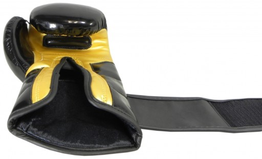 Боксерські рукавички RPU-9 чорно-золотого кольору з високоякісного шкірозамінника. Подовжена манжета довжиною 13 см має вшитий поролон для посилення та захисту області зап’ястя.