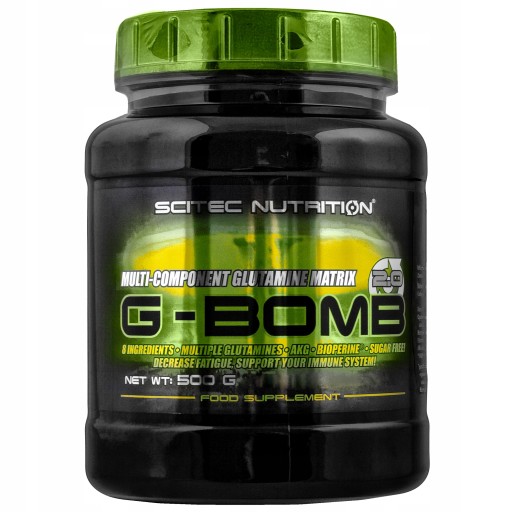 Амінокислота L-глютамін - добре відома і популярна у формі харчової добавки, становить до 60 відсотків амінокислотних ресурсів у скелетних м'язах і використовується всім організмом. Глютамін, що міститься в добавці Scitec G-Bomb, збільшує синтез білка, зменшує можливість пошкодження м'язів, знижує рівень кортизолу та збільшує об'єм клітин. Крім того, глютамін може підняти рівень гормону росту до 400%! Ця амінокислота стабілізує рівень цукру в крові, може збільшити запаси глікогену і зменшує потребу в цукрі. Дослідження показали, що після інтенсивних тренувань бодібілдингу рівень глютаміну в організмі може знизитися до 50%.