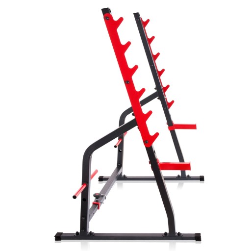 Стійки мають страхувальні гаки, які забезпечать вашу безпеку під час вправ на плечі або присідань зі штангою.