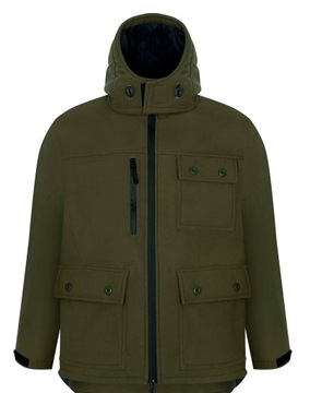 Z przodu dwie kieszenie z patkami ,na guziki– dodatkowo z boku dwie na ręce zapinane na wodoodporne zamki.