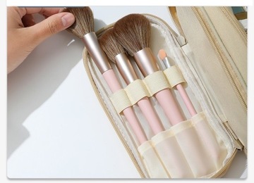 Dodatkowo kosmetyczka zawiera po bokach dwie odpinane na zamek przegródki na pędzle, tusze do rzęs i inne drobne rzeczy.