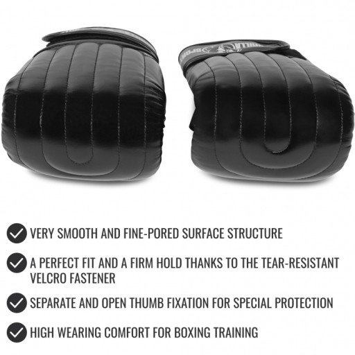 Інтенсивні тренування з боксу вимагають міцного обладнання. Боксерські рукавички Gorilla Sports виготовлені з міцної синтетичної шкіри та мають зручну підкладку, щоб надійно захистити ваші руки під час тренування та знизити ризик потертостей та інших подібних травм. Таке навчання приносить більше задоволення та дає мотивацію для подальшого розвитку. Рукавички призначені тільки для занять з обладнанням, включаючи: з сумкою або боксерським мішком. Завдяки тонкій підкладці та відкритому великому пальцю їх можна легко скласти та зняти без допомоги іншої людини.
