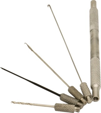 Praktyczny zestaw karpiowy ze stali nierdzewnej. Komplet składa się z bazy z gwintem z dwóch stron, 3 igieł i wiertła.