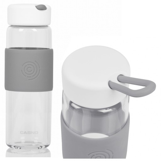 Скляна пляшка для води Casno Ontario 520 мл відрізняється високою естетичністю. Сіра поліпропіленова стрічка підвищує естетичну цінність і покращує зчеплення.