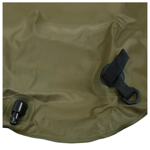 Передня стінка виконана з міцного нейлону Rip-Stop камуфляжного кольору. Задня прозора стінка з товстого ПВХ матеріалу дозволяє перевіряти залишок води та її чистоту. Стінка з ПВХ розсіює сонячні промені, вода діє як лінза і фокусує сонце на чорній внутрішній стінці, яка нагріває воду. Чорний колір і особлива структура матеріалу притягує сонячні промені, гарантує швидке нагрівання рідини. Матеріал нетоксичний і безпечний у використанні. До нейлону були прикріплені литник, гніздо трубки та підвісні фітинги. D-кільця дозволяють повісити його горизонтально або надіти на підтяжки, душ можна носити як рюкзак.