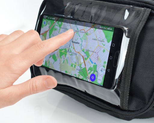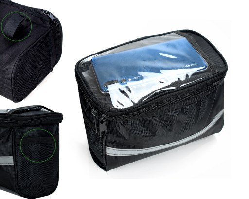 Сумка має спеціальну кишеню зі спеціальною фольгою, що проводить дотик. Кишеня має великий розмір: 11см х 16см. Він підійде для більшості телефонів на ринку. Під час руху ми можемо легко перевірити навігацію або відповісти на дзвінок у режимі гучного зв’язку, не зупиняючись і дістаючи телефон. Передня кишеня з плівкою також може використовуватися як кишеня для карти.