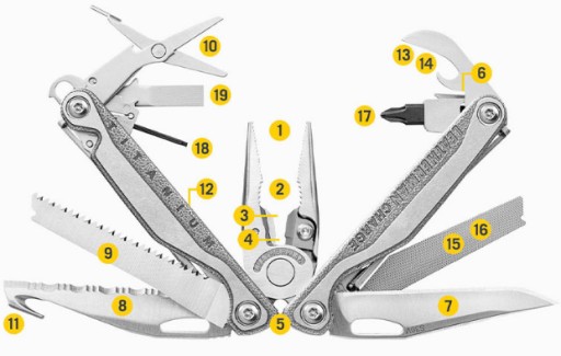 Гладке лезо ножа, зубчасте лезо ножа, пилку та напилок можна відкрити без необхідності розгортати плоскогубці. Завдяки отворам для великого пальця леза ножа можна миттєво відкрити однією рукою. Ці 4 інструменти замикаються окремими фіксаторами вкладишів, інші взаємодіють із двома храповими замками, подібними до системи зворотного фіксатора.