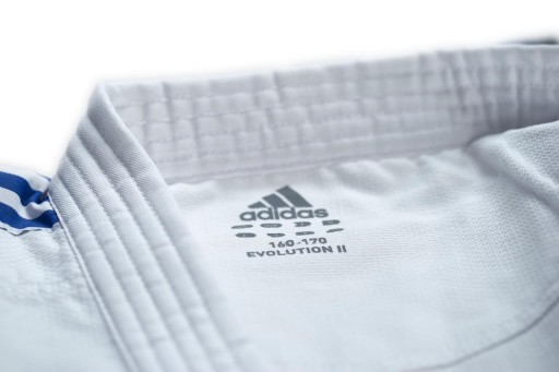 Біле вбрання. На рукавах є нашивки з білими смужками та біркою adidas. Внизу коміра є гладка нашивка з логотипом Adidas. У комплект входить: світшот, еластичні штани на зав'язках і білий пояс, який може бути без нашивки виробника.