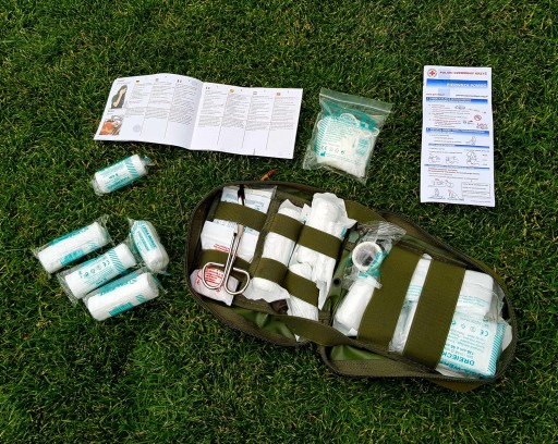У набір входить необхідний набір перев'язувального матеріалу та інструменти для надання першої допомоги.