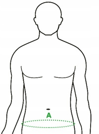 - A: Обхват стегон - вимірюємо обхват стегон на одній висоті.