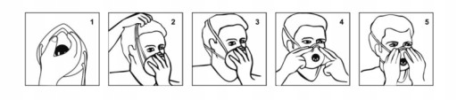 5. Перевірте, чи респіратор одягнений належним чином і щільно затягнутий. Покладіть обидві руки на маску та з силою видихніть. Якщо повітря надходить через боки або виходить таким чином, відрегулюйте положення респіратора на обличчі.