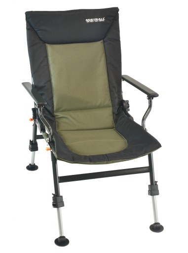 Рибальський стілець зі спинкою Mistrall. Зручне крісло для рибалок, які цінують комфорт під час риболовлі, оснащене плавним регулюванням сидіння, якісним дихаючим матеріалом, порошковим покриттям, алюмінієвими підлокітниками. Він легко розкладається, має телескопічні, висувні та регульовані ніжки, оснащені кронштейнами, які запобігають просіданню крісла в землю. Регульовані ніжки дозволяють пристосувати крісло до нерівності місцевості кожного місця риболовлі. Всередині матеріалу вшита м'яка губка, що робить крісло дуже комфортним. Є можливість розкласти крісло до повністю лежачого положення.