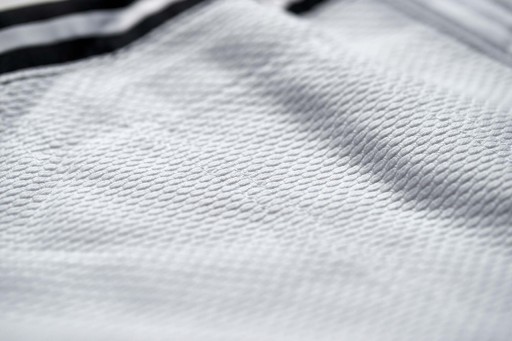Використана суміш бавовни та поліестеру робить куртку для дзюдо більш стійкою до розривів, легшою в носінні та зручнішою для прання. Ззаду є додатковий зміцнюючий шов.
