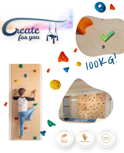 - Щільно розташовані отвори дозволяють змінювати положення захоплень. Це дозволяє регулювати рівень складності відповідно до віку та навичок дитини.