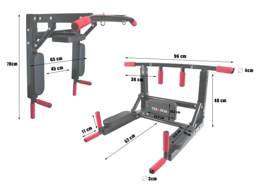 Все це вішається на стіну за допомогою спеціальних гачків, що входять в комплект. Якщо ви хочете змінити розташування оснащення, просто змініть положення елемента на гачках. Виробник подбав і про комфорт занять, доповнивши поручень зручною спинкою і підлокітниками, обтягнутими тканиною.