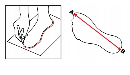 Потім обведіть стопу, як показано на малюнку, а потім виміряйте відстань між двома найдальшими точками (відстань AB).