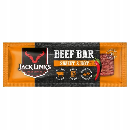 Jack Links Beef Bar Sweet&Hot м’ясний батончик з яловичини найвищої якості, з солодким і гострим смаком. Високий вміст білка та низький вміст жиру робить його ідеальною та корисною закускою для туристів, мандрівників, спортсменів та водіїв.
