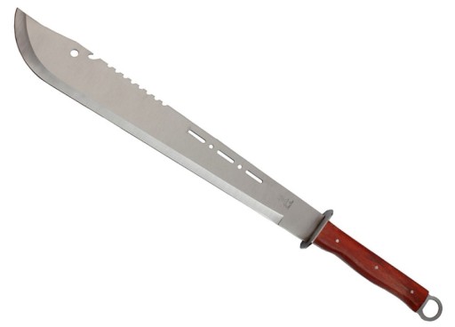 Велике мачете N-615B — це потужний і міцний інструмент, який ідеально підходить для корчування, рубання та рубання. Він чудово підійде під час прополки городу, будівництва табору чи перетину кущів. Мачете виготовлено з моноліту з нержавіючої сталі 420, який проходить по всій довжині. Цей матеріал надзвичайно стійкий до можливих пошкоджень і затуплення. Довге та велике лезо з профілем затискача, на додаток до гладкого леза, оснащене маленькою кулькою та відкривачкою для пляшок на звороті. Крім того, вушко дозволяє зручно повісити мачете на гачок або цвях. Зручна рукоятка виконана з обшивки натурального дерева, яка кріпиться заклепками до сталевої рами. Ручка досить довга і дозволяє тримати мечеть двома руками. Широка сталева поперечина ефективно захищає руку від ковзання до ріжучої кромки. У задній частині внутрішній моноліт утворює кільце для кріплення шнура, брелока або шнурка.