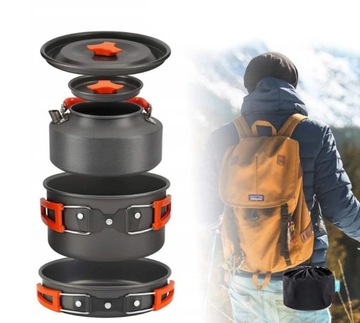Zestaw naczyń turystycznych, który przyda się na każdym campingu i wycieczce. Składa się z 10 części i pokrowca do przenoszenia: