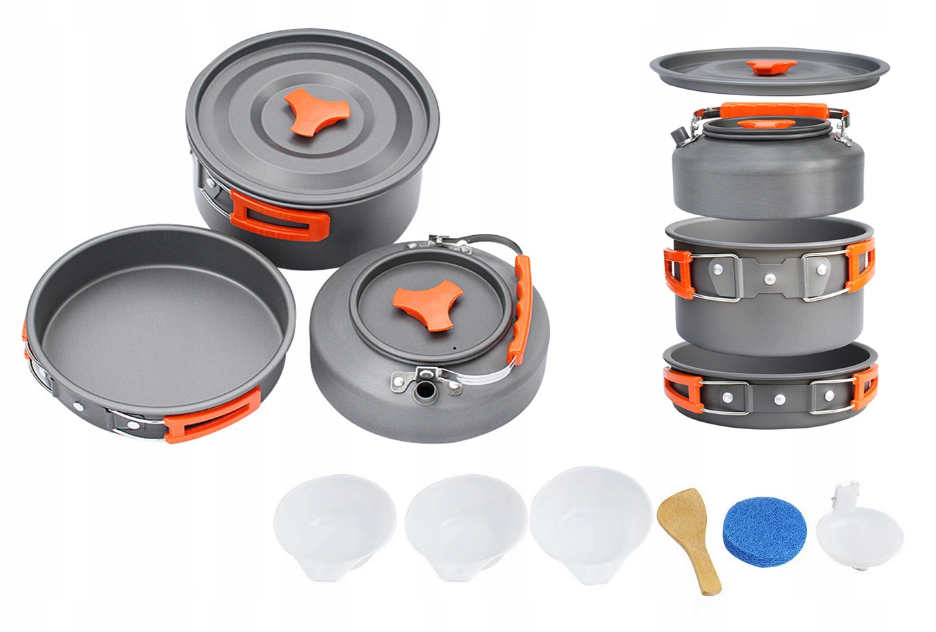 - Nasz zestaw to aż 10 niezbędnych elementów potrzebnych każdemu turyście: garnek, patelnia, czajnik, pokrywka, czyścik, drewniana łyżka, plastikowa składana chochelka, oraz 3 plastikowe miseczki do jedzenia.