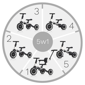 - Wersje rowerka: 6w1, Wózek spacerowy (od 1 do 2 lat), jeździk trójkołowy (od 1 do 2 lat dziecka), rowerek trójkołowy (od 2 do 3 lat), rowerek biegowy (od 3 do 4 lat), rowerek, rowerek dwukołowy z popychaczem (od 4 do 5 lat), rower dwukołowy