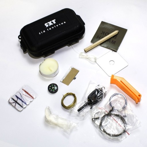 Водонепроникна коробка, в якій: компас, сірники, розпалювач, пилка, гачки, волосінь та голка, нитка, дзеркало, ватна паличка, інструкція англійською мовою.