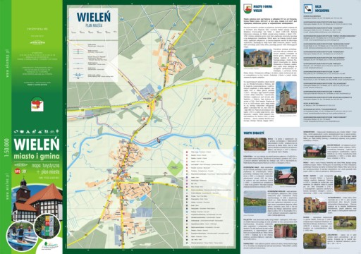 Картографічна частина: туристична карта гміни Велень з прилеглими районами, план міста Велень, батиметричні карти, легенда польською, німецькою та англійською мовами.