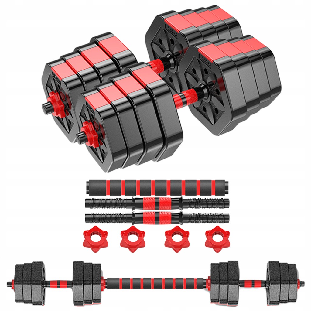 Wysokiej jakości zestaw treningowy wyposażony w specjalną konstrukcję. Posiada uchwyty montażowe oraz sztangę. Zestaw umożliwia uzyskanie dwóch urządzeń do ćwiczeń: sztangi oraz hantli. Stanowi idealne uzupełnienie do domowej siłowni.