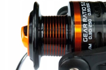 Kołowrotek o wysokim standardzie wykończenia. Wyposażony w bardzo precyzyjny hamulec znajdujący się w górnej części szpuli oraz 6 łożysk.