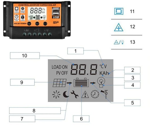 Цей контролер має функцію регулювання освітлення за часом після настання темряви, сонячне світло не потрапляє на сонячні батареї, а перемикач активує вихід постійного струму на певний період часу. Він також працює в ручному режимі, контролюючи процес розряду акумулятора.