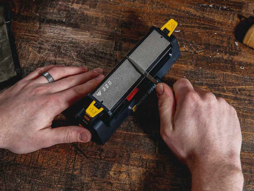 Work Sharp Benchstone має напрямні під кутом 20° і 25° (прикріплені магнітом). Приклавши головку ножа до напрямної, достатньо рівномірно перетягнути лезо по заточувальній пластині під постійним кутом.