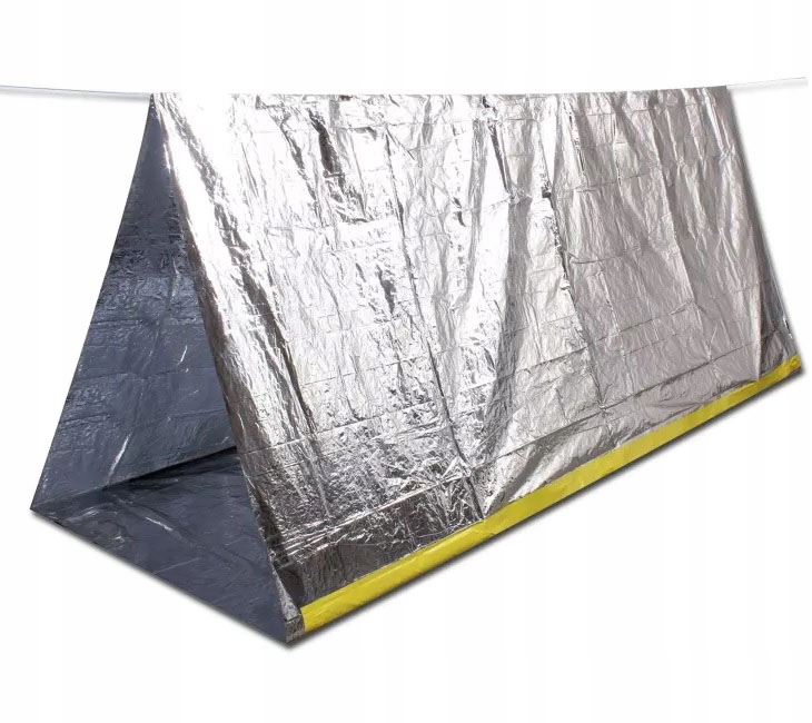 Namiot termiczny. ratunkowy wykonany z wysokiej jakości folii używanej w ratownictwie, turystyce i wspinaczce oraz sytuacjach awaryjnych lub warunkach ekstremalnych. Zastosowana folia jest całkowicie wodoodporna i wiatroodporna. Cienka, metalizowana płachta (folia NRC), zapobiega wychłodzeniu organizmu w sytuacjach ekstremalnych i poprawia komfort termiczny. Jest bardzo małych rozmiarów i bardzo lekki. Zmieści się w każdym plecaku czy torbie. Istnieje możliwość rozłożenia namiotu w taki sposób, aby zatrzymywał ciepło bądź nie dopuszczał do przegrzania się, zależnie od strony folii znajdującej się na zewnątrz.
