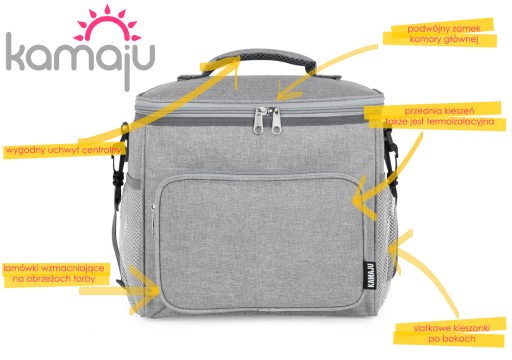 Термосумка - утеплювач "холодильник" Kamaju з великим основним відділенням, додатковим переднім відділенням і сіткою з боків. Виріб довго зберігає низьку або високу температуру. Зручна універсальна ручка на рамі полегшить перенесення сумки.