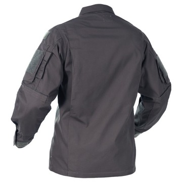 Bluza zapinana na duże, wygodne guziki kryte patką. Wysoki kołnierz z opcją zapięcia pod brodą, dla lepszego komfortu termicznego, ochrony i maskowania szyi. Zaszewki na plecach dla pełnej swobody ruchów. Pod pachami umieszczono obszyte otwory wentylacyjne. Mankiety regulowane za pomocą rzepa. Dublowane szwy.