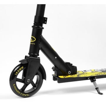 - Ponadto hulajnoga wyposażona w błotniki oraz nóżkę-podpórkę. Tylny błotnik służy jako hamulec.